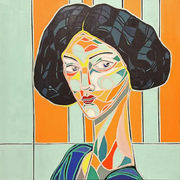 This fractured portrait reimagines the traditional portrait through a cubist lens the subjects gaze suggests vulnerability and strength.
